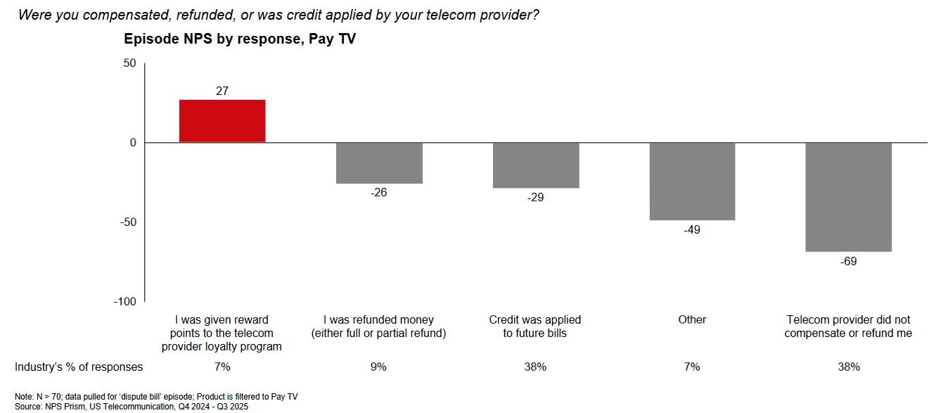 Compensation also doesn’t have to take the form of cash refunds or account credits to satisfy customers. When asked how they were compensated by their provider, customers who received loyalty reward points deliver the highest Episode NPS, outperforming refunds and bill credits by a wide margin. These findings suggest that sentiment can still be protected even when direct refunds can’t be offered to the customer.