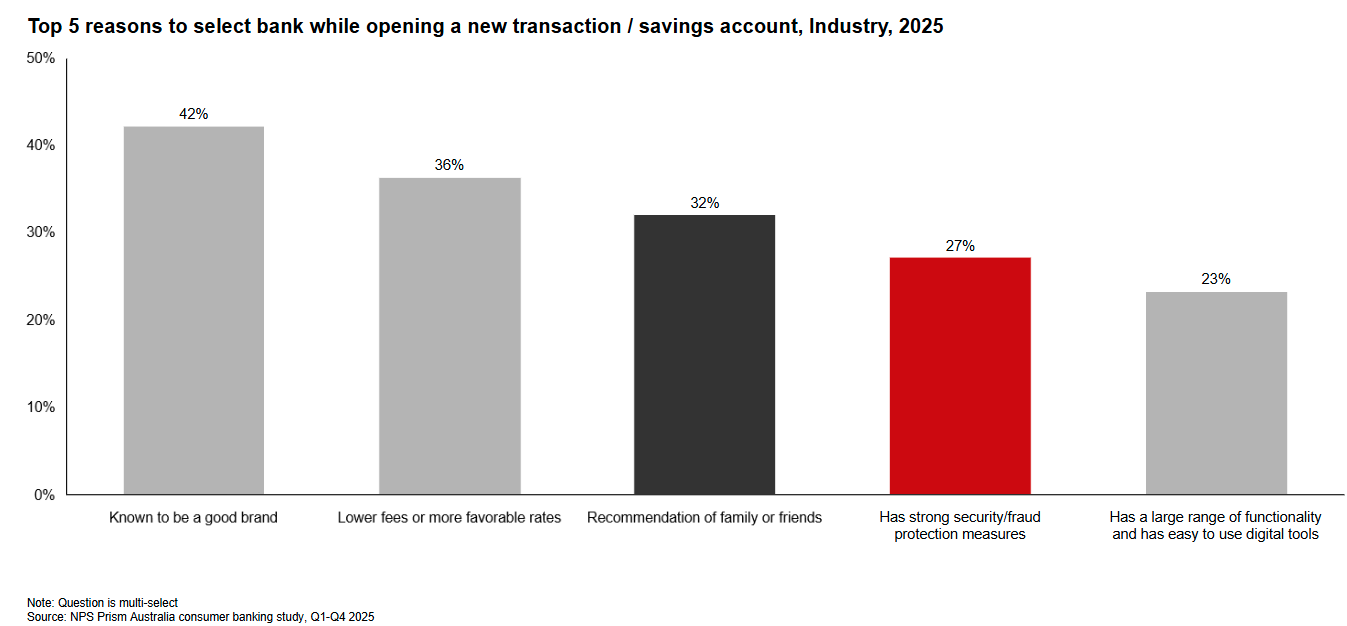 Furthermore, the presence of strong security and fraud protection measures, and the recommendation of friends and family, are both among the top five factors influencing a customer’s decision to open a new transaction or savings account. Customers want to know they’ll be protected when potential fraud arises, and since they often turn to peers for recommendations when it comes to considering a new bank, customer advocacy around fraud measures can be a key lever for new customer acquisition.