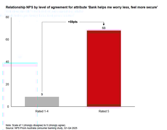 NPS Prism data indicates that when customers strongly agree that their banks helps them worry less and feel more secure, they deliver a Net Promoter Score (NPS) 59 points higher on average than when they report a lower feeling of security, demonstrating that protection from banking threats is a crucial factor in their likelihood to recommend their bank to friends and family.