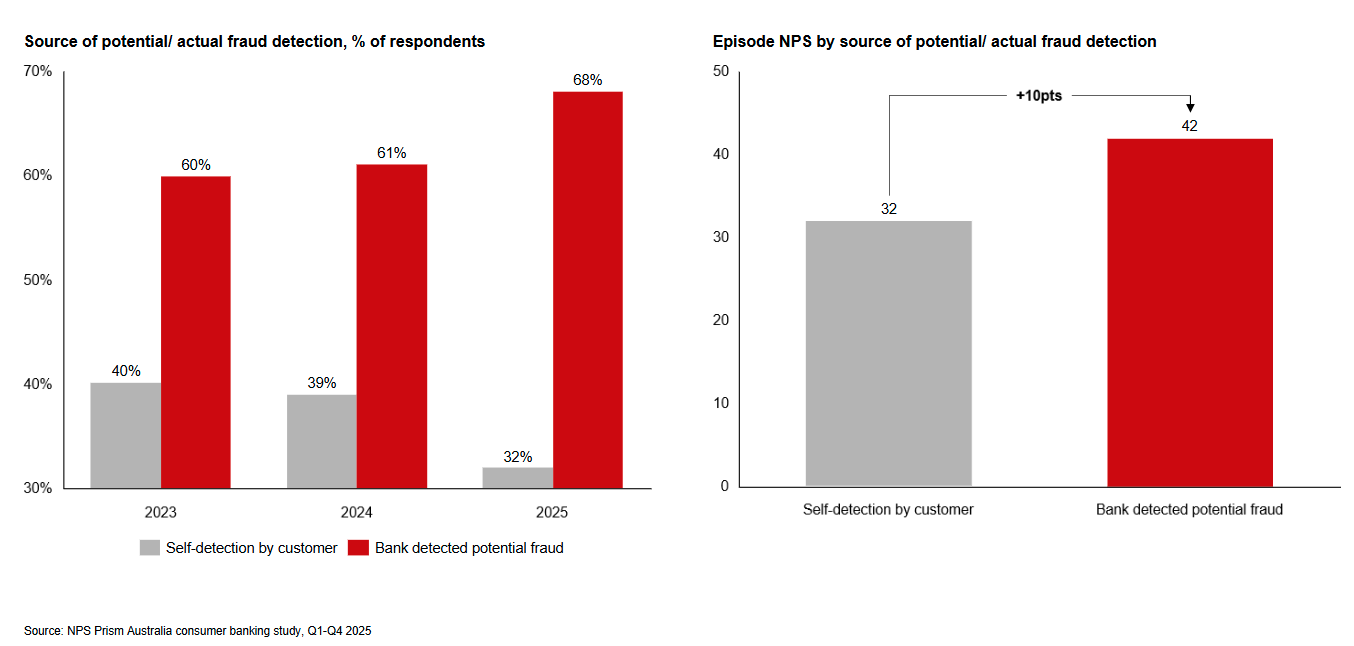 Banks are improving at being the first to detect potential fraud, with rates increasing by around 7 percentage points year-over-year. However, whether fraud is detected by the bank or the customer themselves has minimal impact on NPS, with an uplift of only 10 points when a bank detects the fraud vs. a customer.