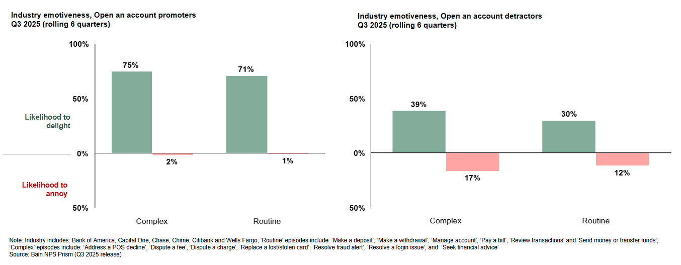 Q3 2025 NPS Prism data on several players across the industry reveals that when customers complete the account-opening experience as a Promoter, meaning they have a higher Net Promoter Score (NPS) and are likely to recommend the bank to a friend, their future interactions with their bank are much more likely to delight rather than annoy them.