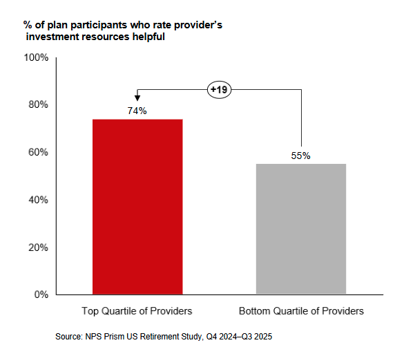 Plan providers with top-quartile NPS see 74% of their clients rating their investment resources as helpful, compared to only 55% of clients of bottom-quartile providers.