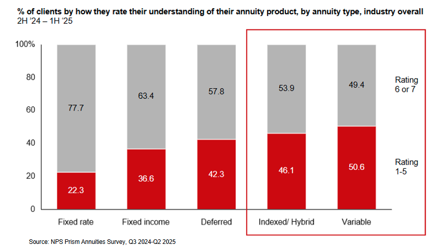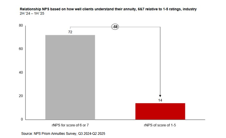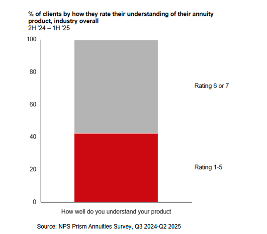 Less than half of annuities clients understand their product, significantly impacting brand-level NPSNearly 40% of annuities clients signal that they do not fully understand their annuity product—a factor that NPS Prism data shows is a critical driver of brand-level NPS. When clients rate their understanding as falling between a 1 to 5 on a scale of 7, as opposed to a 6 or 7, providers face an average NPS penalty of 58 points, indicating that providers should ensure clients have a thorough understanding of their annuity product to drive overall satisfaction.