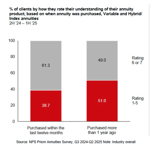 Around 50% of clients with a variable annuity have limited understanding of the policy, while only about 20% of clients with a fixed rate annuity feel that way. Ratings between 1-5 (lower understanding of product) increase by ~12% for variable and hybrid/indexed products purchased over a year prior, suggesting that clients may be less clear on the details of their policy the further out they are from the purchase process.