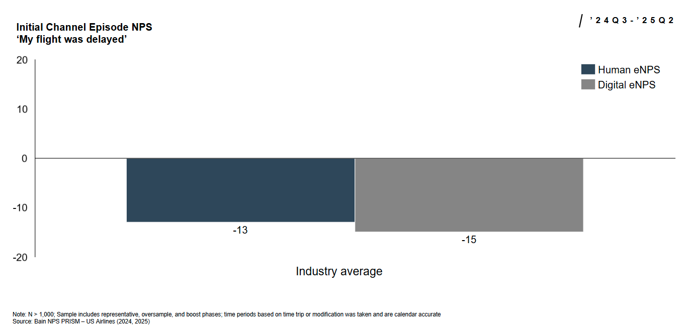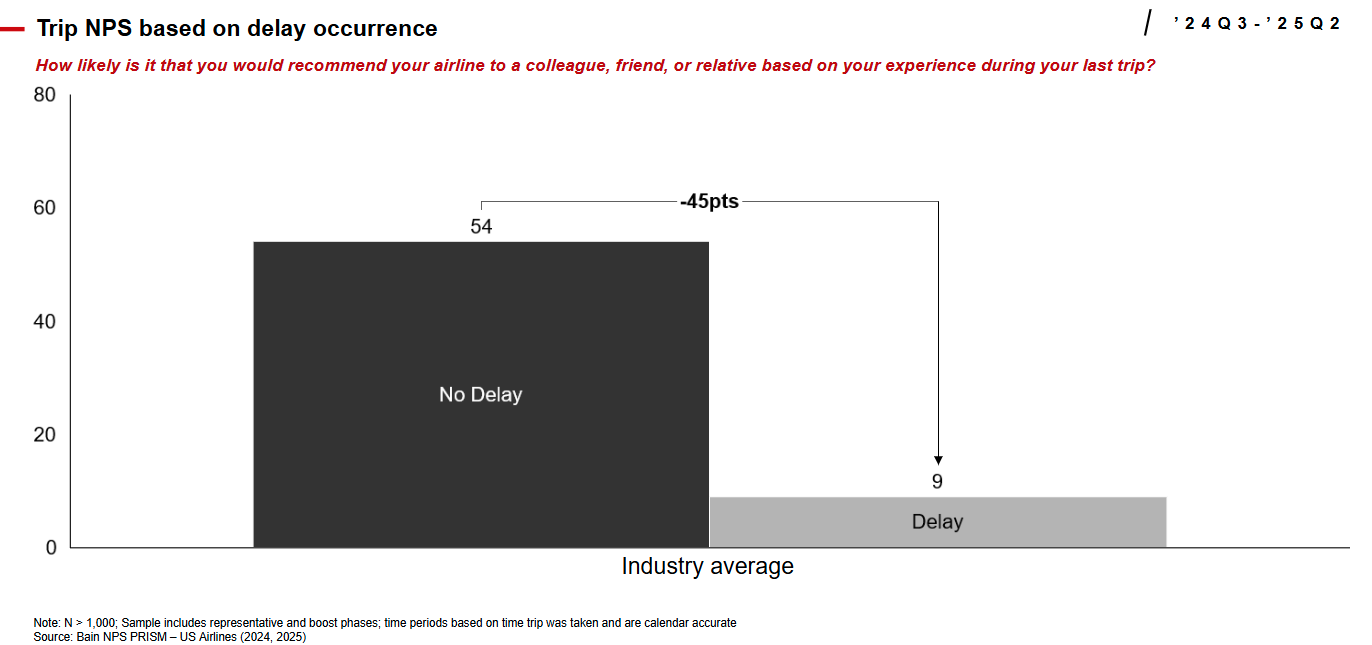 Flight delays can greatly impact brand sentiment for U.S. airlines. On average, customers who experience a delay report a Net Promoter Score for their trip that is 45 points lower than those who are on time, according to NPS Prism data from Q3 2024 – Q2 2025.