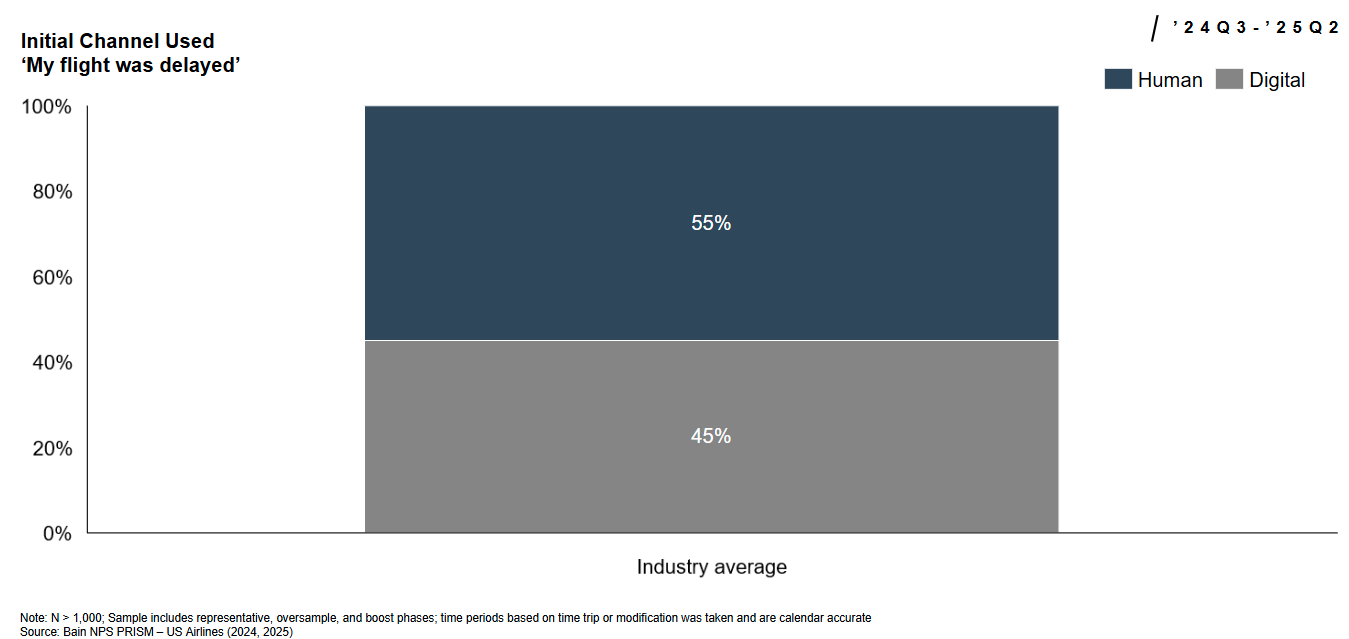 NPS Prism data demonstrates that airline customers are still slightly more likely to use human channels to navigate a flight delay, with 55% of respondents beginning the “flight delay” customer journey with a human rather than through a digital channel. However, both channels, on average, produce negative journey NPS, suggesting that most airlines are still looking to crack the code on how best to help delayed travelers who reach out for assistance.