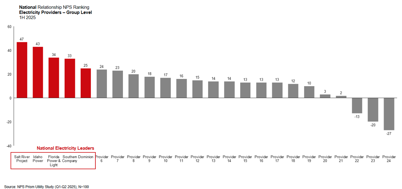 NPS Prism data from Q1 & Q2 2025 has revealed which U.S. utilities lead the industry nationwide in delivering exceptional customer experience, as evidenced by their Relationship Net Promoter Score, which measures overall likelihood to recommend a particular utility provider.