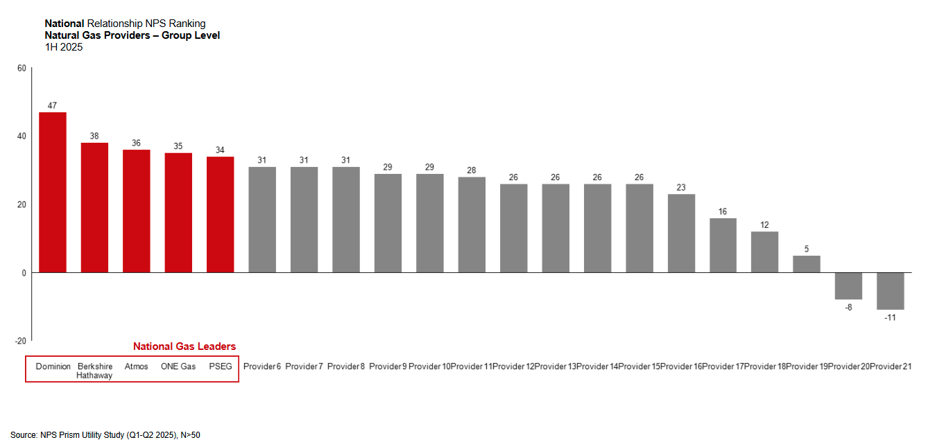 For U.S. natural gas companies, Dominion emerged as the distinct industry leader, with a 9-point lead over the second-ranked provider. The rest of the top five—Berkshire Hathaway, Atmos, ONE Gas, and PSEG—all received a Relationship NPS in the mid-to-high 30s.